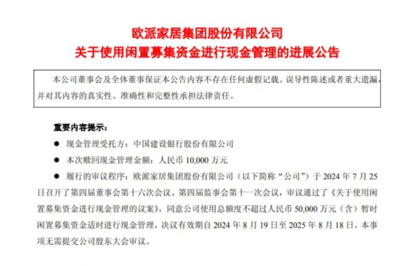 8月1号,欧派家居集团股份有限公司(股票代码:603833)发布公告,宣布此前使用闲置募集资金购买的1亿元结构性存款已到期赎回,实际年化收益率为1.26%,共获得收益65.72万元。该笔资金已全部归还至公司募集资金专用账户。