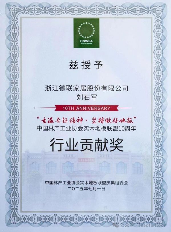 7月1日,在一场以"重温长征精神,坚持做好地板"为主题的中国实木地板联盟成立十周年庆典上,浙江德联家居股份有限公司以卓越的品牌建设成果和行业影响力斩获“行业贡献奖”。