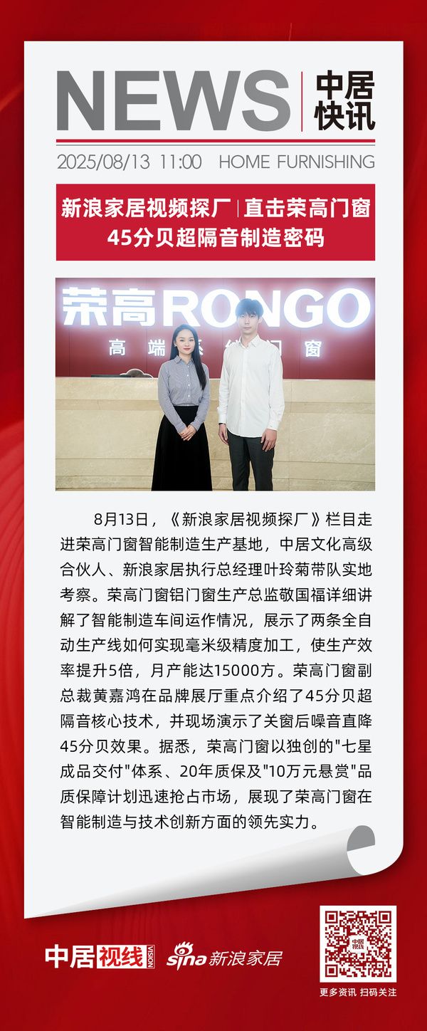 8月13日,《新浪家居视频探厂》栏目走进荣高门窗智能制造生产基地,中居文化高级合伙人、新浪家居执行总经理叶玲菊带队实地考察。荣高门窗铝门窗生产总监敬国福详细讲解了智能制造车间运作情况,展示了两条全自动生产线如何实现毫米级精度加工,使生产效率提升5倍,月产能达15000方。荣高门窗副总裁黄嘉鸿在品牌展厅重点介绍了45分贝超隔音核心技术,并现场演示了关窗后噪音直降45分贝效果。据悉,荣高门窗以独创的"七星成品交付"体系、20年质保及"10万元悬赏"品质保障计划迅速抢占市场,展现了荣高门窗在智能制造与技术创新方面的领先实力。