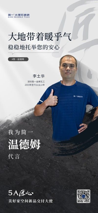 22年的日升月落里,李土华的掌心总带着瓷砖的温度。从第一次在老家湛江贴砖时的生涩,到如今在深圳高端住宅里让瓷砖“服帖扎根”的笃定,他把“贴稳每块砖”这件事,做了整整22年。在简一的12年,这份笃定更成了与“精细”较劲的底气。如今作为5A匠心・美好家空间新品交付大使,他带着“温德姆”走来,用掌心的力道诉说空间的安稳——每一次瓷砖的贴合,都是对家的踏实承诺。