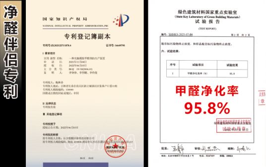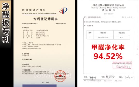 2、大吉净醛板(专利号 :202120767184X),净醛板解决了家装中木制品定制的甲醛问题;净醛板自身环保性极高,远超ENF级同时净醛板对空气中的甲醛有一定的去除作用。
