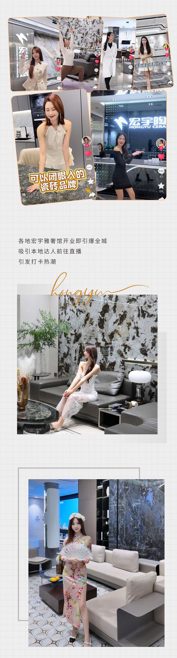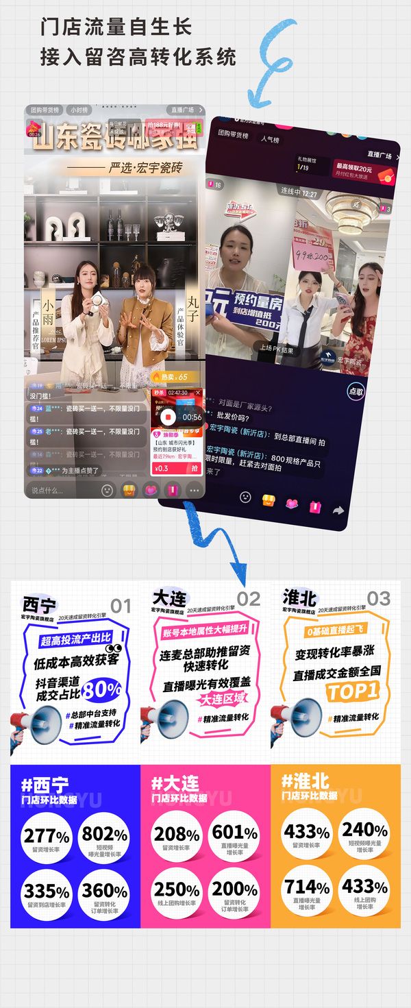 宏宇陶瓷雅奢旗舰店(4.0展厅)契合年轻群体社交需求,成为区域打卡地标。2025年全国多家终端门店借助抖音/小红书平台,接入宏宇新零售4.0留咨转化引擎,以全新短直双开流量模式,门店线上总曝光超千万次,单店留咨转化增长率突破300%,实现“流量自生长,留咨高转化”。