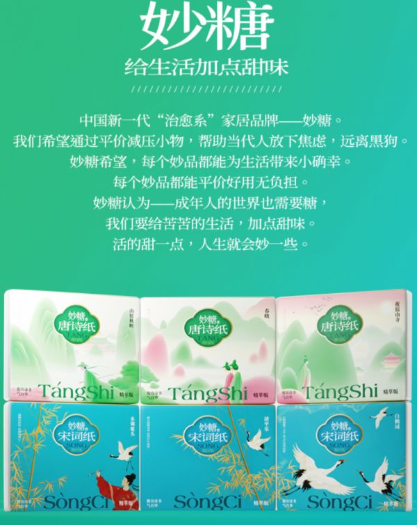 妙糖家居成立于2017年,定位为“情绪家居”品牌,使命是“生活加点糖”。此次“唐诗纸/宋词纸”不仅延续了情绪价值,还把高频日用品与文化内容深度绑定,被视为品牌从“情绪价值”向“教育陪伴”场景的再扩张。