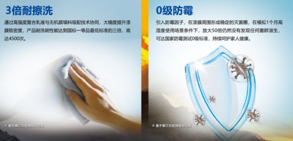 其高达4500次的三倍耐擦洗特性,让墙面历久弥新;而0级防霉特性则可有效抑制霉菌滋生,守护墙面干爽洁净的同时,呵护萌娃的健康童年。