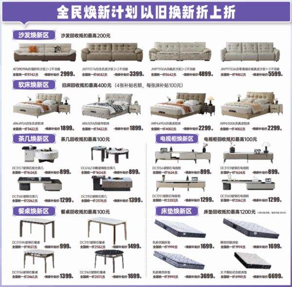 沙发坐塌了?床垫变形了?旧家具都别扔,太子家居以旧换新最高补贴5000元,包含“3000元新购家具补贴券+送价值2000元旧家具拆除清运服务”。沙发回收抵扣最高200元;餐桌、茶几、书桌、餐边柜、电视柜、鞋柜、茶台、妆台、斗柜回收抵扣最高100元;旧床回收抵扣最高400元(4张补贴名额,每张床补贴100元);床垫回收抵扣最高1200元(4张补贴名额,每张补贴300元);衣柜回收抵扣最高300元(3张补贴名额,每张补贴100元)。具体以旧换新产品如下图,详情也可微信搜索小程序“太子云商城”咨询了解。