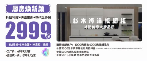 用了10年的橱柜上沾满了油渍,每次打开橱柜都能看到柜里潮湿烂掉的木头,这次趁着太子家居“全民焕新季”活动换上新橱柜吧!全国统一价8999元/套的杉木海洋版橱柜,活动价只要2999元,3M地柜+ 3M台面+1M吊柜全包含,ENF级环保板材,切菜做饭再也闻不到异味。旧厨房换新还能1000元抢4000元大礼包:价值3000元卡萨帝烟机灶具抵扣券(CXW-258-Y1T烟机+JZT-C2G78FG灶具可用,全国统一价10198元,活动价5499元)+价值500元建筑垃圾清运补贴+价值500元旧柜体免暴力破坏专业拆除 。建筑垃圾有人清,旧柜体拆除还不损伤墙面,这可省钱又省心。
