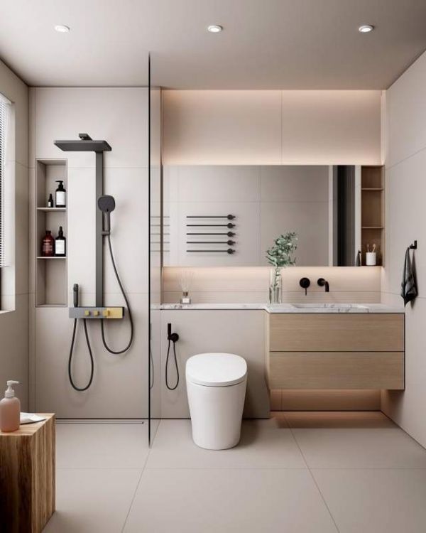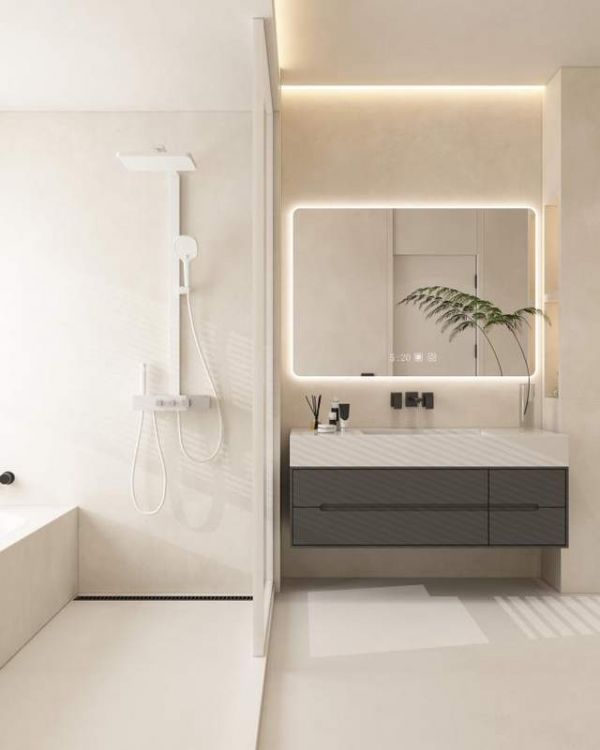 此外,智能灯镜提供均匀柔和的光线,既方便梳妆打扮,又营造了一个温馨舒适的氛围。线性灯带隐藏在浴室柜底部、淋浴区角落等位置,隐形且浪漫,让浴室瞬间变身放松身心的私密空间。