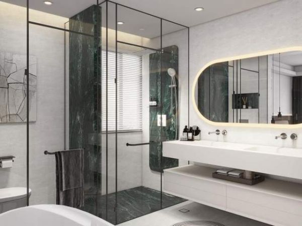 无缝一体墙面设计更是将浪漫推向极致。通过标准化模块组合,洗漱区、淋浴区、如厕区形成视觉上的完整叙事。当洗漱或梳妆时,站在无缝衔接的岩板台面前,指尖触碰到的不仅是材质的细腻,更是设计师将"完整无缺"的美好寓意融入空间的匠心。