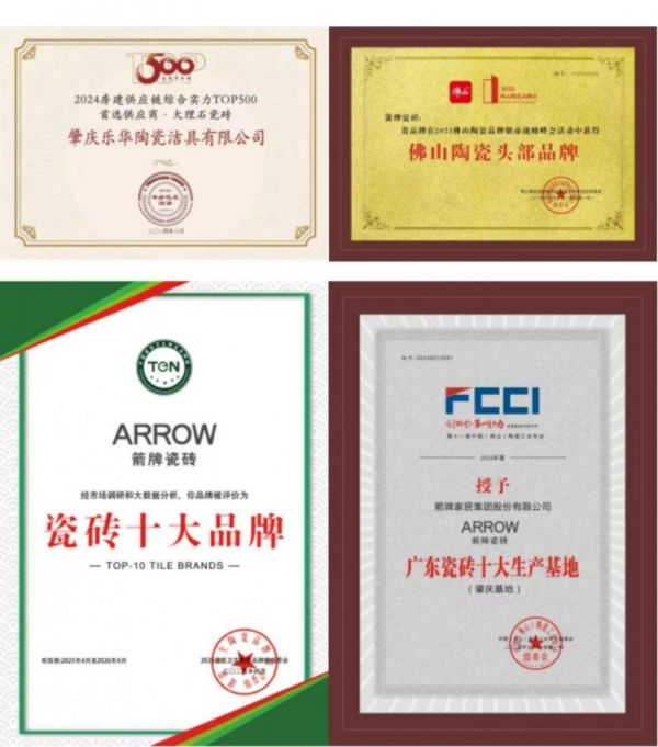 箭牌瓷砖深耕行业18年 , 凭借品牌硬实力,获行业与消费者的一致肯定。箭牌瓷砖连续5年荣获“瓷砖十大品牌”大奖、连续4年获“中国房地产品牌500强首选供应商”、连续4年荣获“领军品牌“大奖,2025年荣获佛山陶瓷头部品牌大奖等重磅奖项。