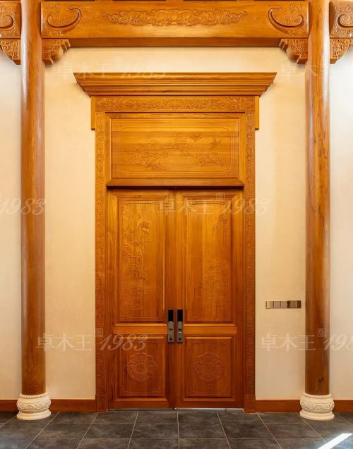由卓木王红木整装定制的宅门,尽显非凡气度。宅门选用厚达8公分的缅甸柚木,4.1米的通高门扇取整根原木打造而成,不仅防晒防潮,更能在岁月流转中保持崭新姿态。卓木王工匠们巧施刀工,门楣处牡丹与花鸟栩栩如生,传递“富贵祥和”的美好期许;门扇上莲花与鹭鸟相映成趣,暗藏“一路连科”的吉祥寓意。卓木王倾力打造的这座宅门,巧妙融合“随墙门”风格,将中式美学的大气磅礴展现得淋漓尽致。
