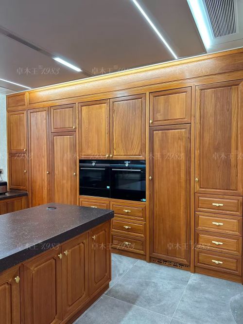 红木整装厨房同样展现了卓木王的精湛技艺。缅甸柚木整装定制的橱柜一门到顶,设计简洁大方,不仅增加了收纳空间,还让厨房看起来更加整洁有序。冰箱巧妙地嵌入墙体,实现了一体化隐形的效果,使厨房的整体风格更加统一。