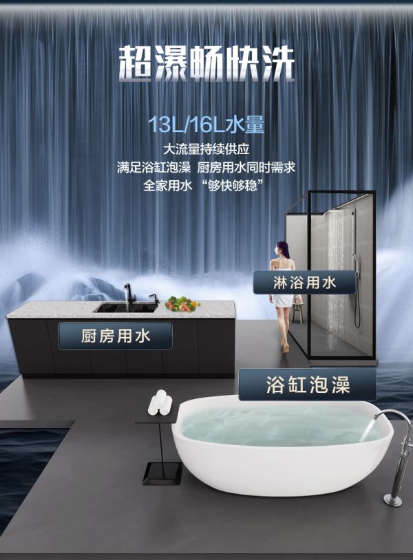 樱花燃气热水器SCH-13/16Q303(A)的13L/16L通量设计,支撑这种多场景并行需求,即使厨房水龙头、洗漱台、淋浴同时开启,热水输出依旧充足,不会出现某处水量骤减的情况。