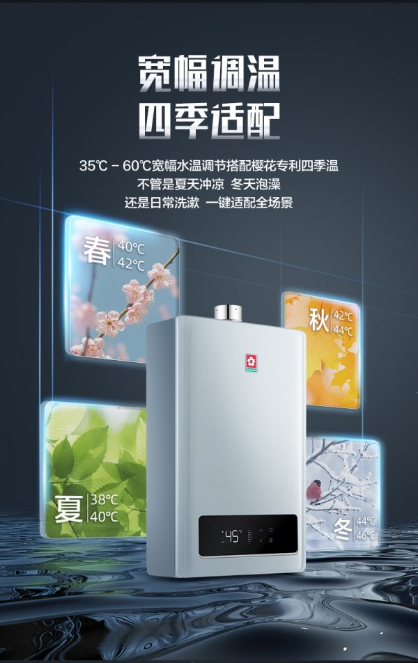 35℃-60℃的宽温域搭配樱花专利四季温模式,让操作化繁为简。春季40-42℃、夏季38-40℃、秋季42-44℃、冬季45-46℃,一键即可匹配季节需求,老人小孩也能轻松驾驭。