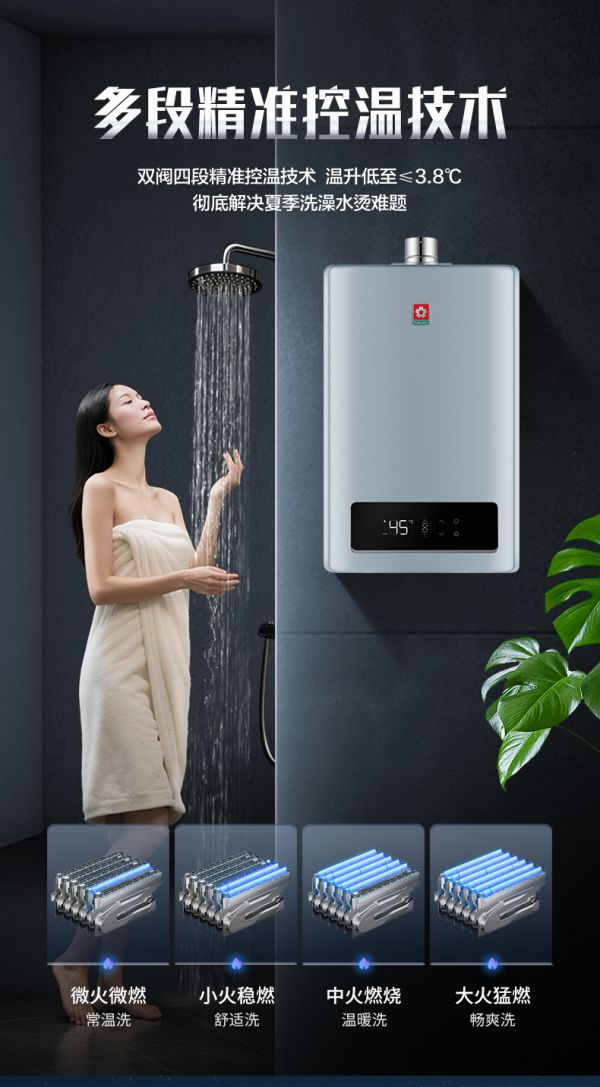 而双阀四段控温技术更是精准到“毫厘之间”,微火微燃(常温洗)、小火稳燃(舒适洗)、中火燃烧(温暖洗)、大火猛燃(畅爽洗)四种模式,将温升控制在3.8℃以内,彻底解决夏季洗澡“水温过烫”的行业难题。