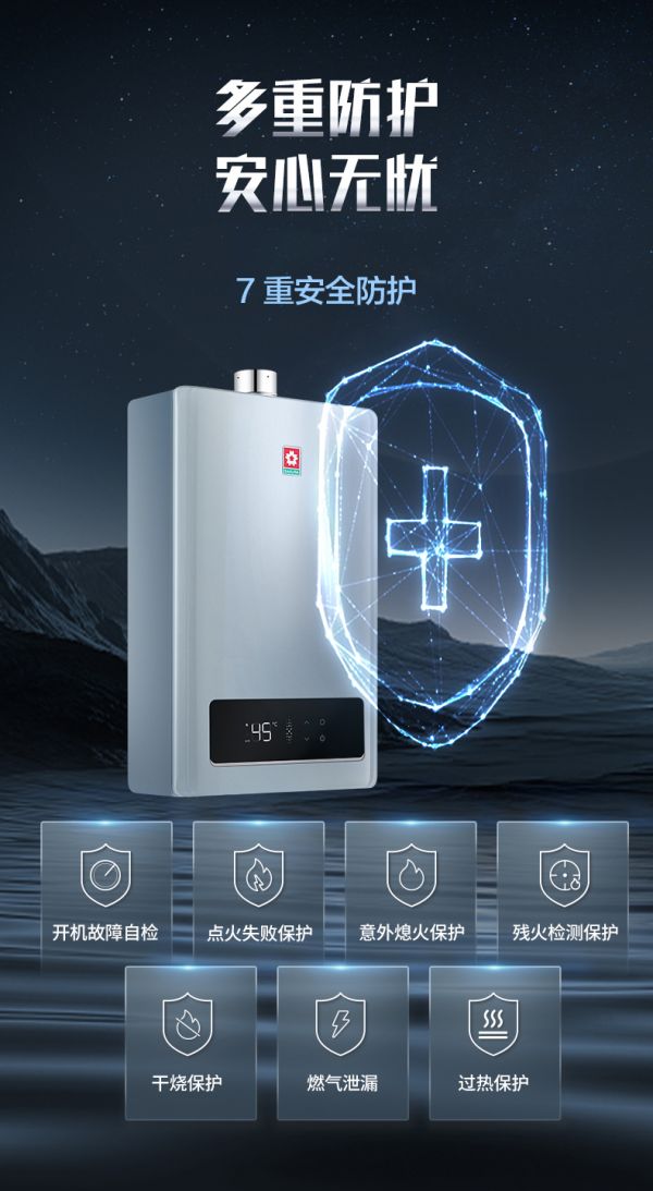家庭用水场景越频繁,安全保障越关键。樱花燃气热水器的七重防护体系,在多场景使用中时刻在线:开机自检确保每次启动,无论清晨洗漱还是深夜厨房用水,都处于安全状态;点火失败保护避免厨房频繁开关水导致的点火异常;干烧保护防止忘记关水龙头后的隐患;漏电保护则在洗漱、厨房等潮湿环境中额外添一份安心。
