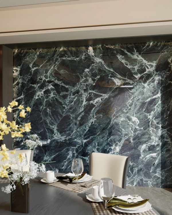 王东华力荐的“阿尔卑斯”,是从意大利传世珍稀矿脉里走来的墨绿诗篇。900x1800mm的规格,让墙面少了拼接的零碎,多了连绵的舒展;墨绿基底从晨雾般的浅淡到深林似的浓郁,层次像油画笔触般细腻。釉面下的结晶脉络,如初春冰裂时迸发的自然张力,在光线下若隐若现。