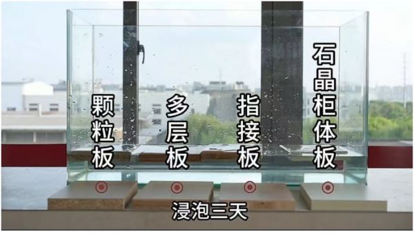 潮湿环境是木地板的天敌,吸水膨胀率直接决定了材料的稳定性和使用寿命。我们将四种常见板材——颗粒板、多层板、指接板、Lamett乐迈石晶柜体板完全浸入水中,进行为期3天的极限浸泡实验,并使用游标卡尺精准测量浸泡前后的厚度变化。