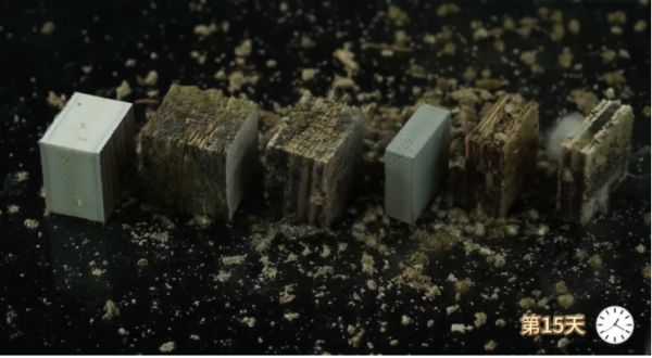 为验证材料的防霉防蛀性能,我们模拟潮湿且虫害肆虐的环境,将六类板材——含不同厚度的颗粒板、多层板、诺富板、刨花板及Lamett乐迈石晶柜体板放入爬满白蚁的密闭空间,持续观察15天,记录霉变与蛀蚀情况。