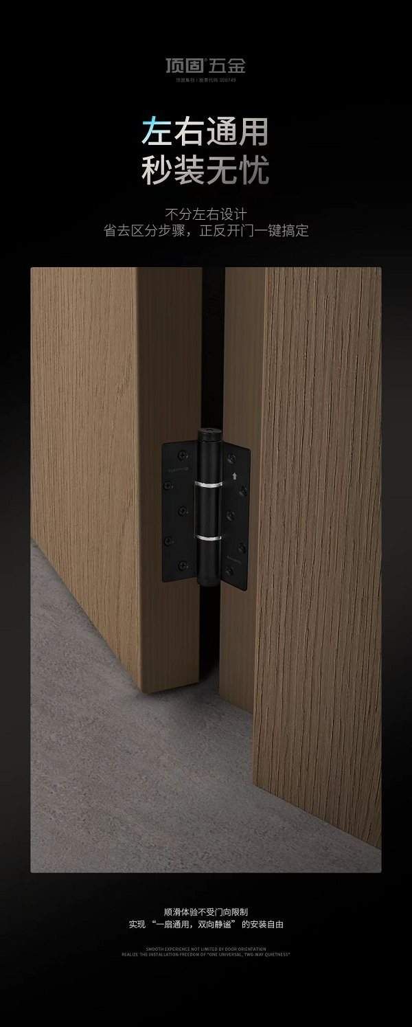 不管是左开的卧室门,还是右开的书房门,甚至是双向开启的厨房推拉门,顶固静音液压合页都能轻松适配。安装时,师傅不用再花时间区分 “左” 和 “右”,只需按照常规步骤固定合页即可,大大减少了核对型号的时间。老周分享道:“以前装一套三室一厅的房子,光确认合页方向就得花半小时,遇到门向复杂的,还得反复跟业主确认,现在用顶固的合页,直接拿出来就能装,一套房子能省出 1 个多小时的时间。”