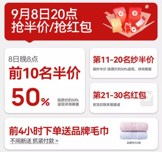 为了鼓励消费者尽早下单,9月8日20:00—23:59内付款的消费者, 均可获赠品牌毛巾2条,让消费者在享受家居焕新的同时,感受到一份来自品牌的温暖关怀。
