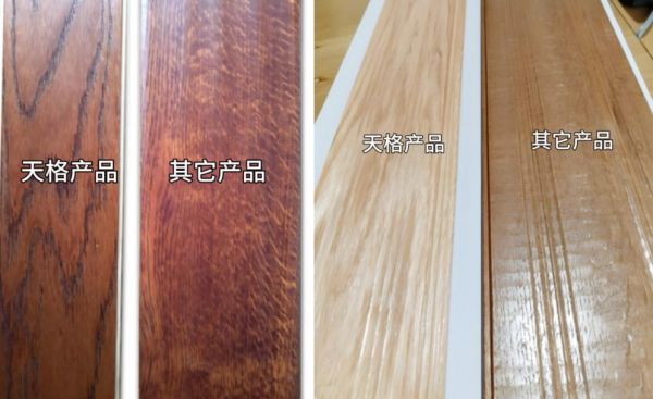 如上图所示,两款产品从正面看,都展现了原木流畅自然的纹理,古典温润细腻的手感。但翻到背面,天格产品(左)的背面是纯正、未经修饰的原木本真的纹理颜色,看起来干干净净;而对比产品(右)则是上色的,与正面颜色相同。天格产品仅在地板表面和倒角上色,地板四周、背面的五个面忠实保留了原木天然本真的颜色,两款产品的对比泾渭分明。
