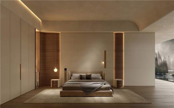 卧室空间以 “舒解身心、静造安眠氛围” 为核心目标,创新采用墙柜一体设计,圆弧墙板取意山川形态,打破传统方正空间的桎梏,为空间赋予流畅的韵律感,帮助使用者缓解日常压力。同时,铝合金饰条巧妙嵌缀于墙板与柜体之间,进一步提升空间轻奢质感,让卧室成为放松身心的舒适港湾。