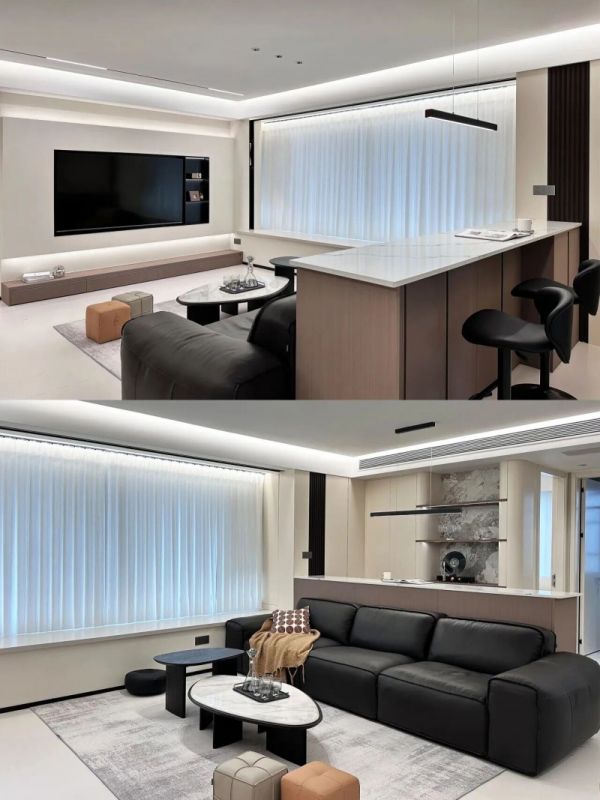 沙发后方定制长吧台,兼具晨间咖啡角、居家办公区与休闲娱乐功能,实用性与空间层次感大幅提升。后墙定制整墙储物柜,搭配艺术背板与内置灯带,营造高级氛围,彰显小资生活仪式感。