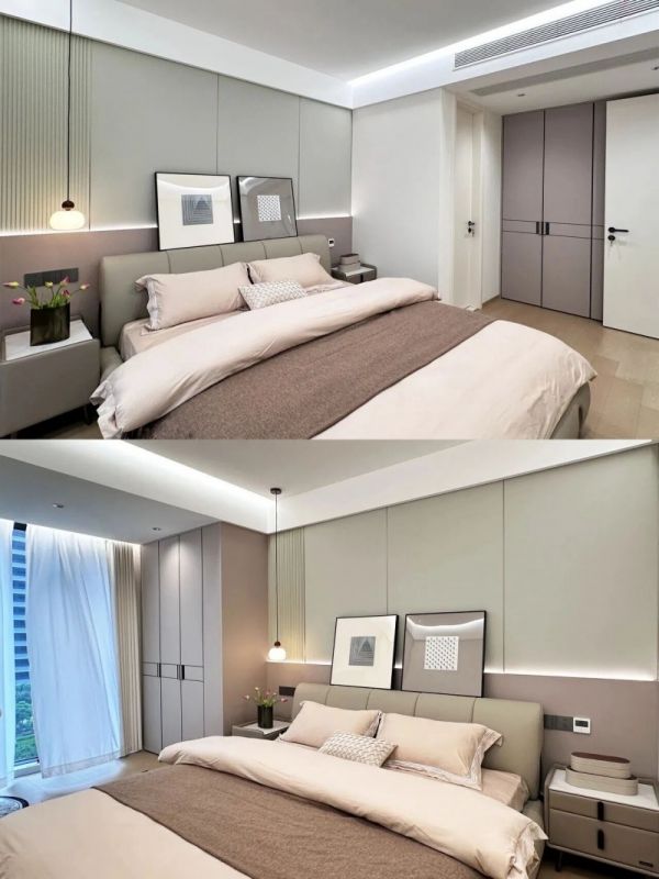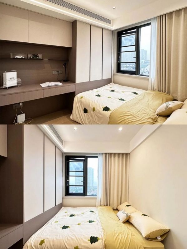 打通阳台后,空间视野与采光显著提升。阳台柜与衣柜采用同系列定制,与床头背景墙色调统一,增强整体感,营造协调舒适的休憩环境。