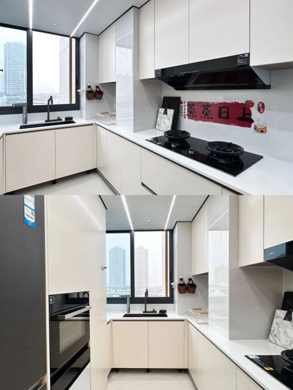 采用小户型高效的U型布局,嵌入式安装电器,保持台面整洁。浅色亮面门板与隐形拉手设计,视觉明亮宽敞,即使仅5㎡也不显拥挤。