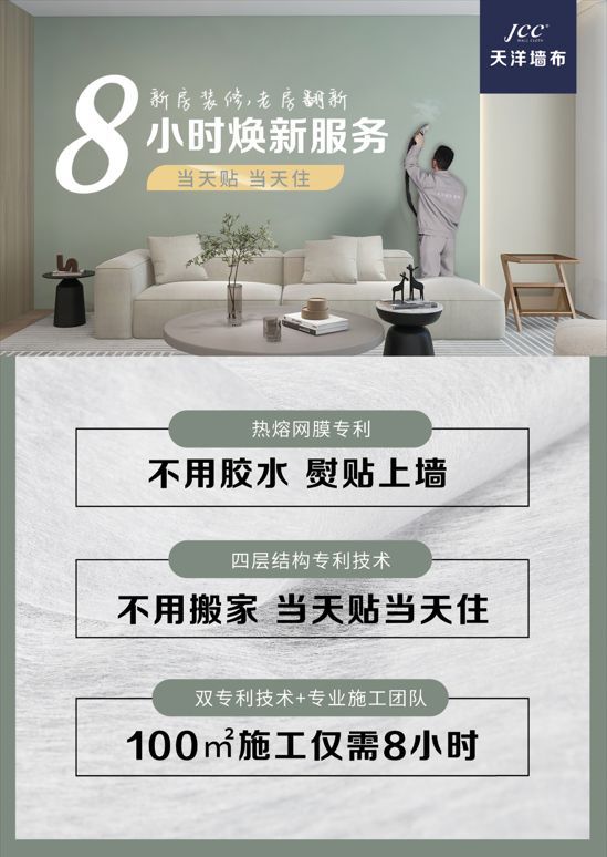 在设计师眼中,天洋墙布最大的魅力在于解决了传统装修的痛点。传统墙面翻新需经历多道工序,耗时长达两周,而天洋的"熨贴上墙"技术,让100平方米空间仅需8小时即可完成,比传统工期缩短90%。