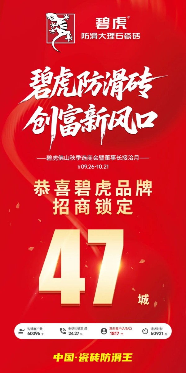 作为陶瓷圈招商战绩数一数二的品牌,自9 月26日秋季全国选商通道开启后,碧虎加盟话题热度直逼100万+,已签约锁定 47 城,签约数据仍在持续攀升中。