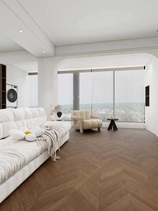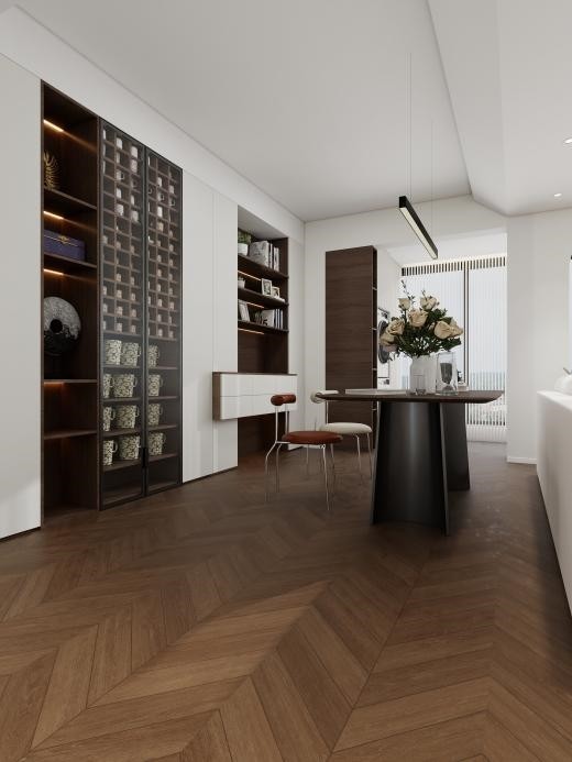 深棕木纹完美衬托家具与软装,鱼骨拼的延伸感让空间更显开阔,而温润的木质肌理则是法式风格温暖、自然气息的来源。