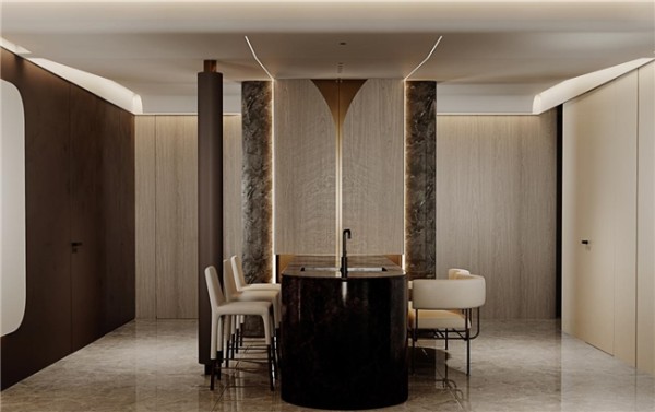 马磊擅长将地域文化元素融入设计中,通过对当地自然景观、色彩和人文符号的理解,将这些元素巧妙地转化为空间语言。不同项目会有不同的文化表达,例如他所设计的住宅中,引用“大漠孤烟直,长河落日圆”的意境,通过沙漠暖土色与红酒色调的叠加、光影与材质的搭配,营造出既宽阔又温暖的空间氛围。他并不依赖单一符号,而是根据项目特性和使用需求,将本地文化融入现代设计,使每个空间都呈现独特的文化底蕴与美学体验。