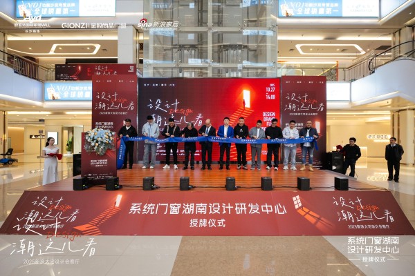致辞环节后,授牌仪式在庄重的音乐与全场瞩目中举行。金致集团董事长范泽金、唐军总经理、李金龙会长、王湘苏会长共同揭幕,"系统门窗湖南设计研发中心"正式挂牌成立,标志着金致尚品门窗在设计研发体系的进一步完善深化。