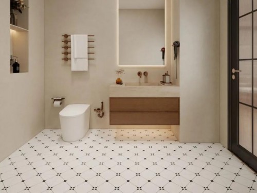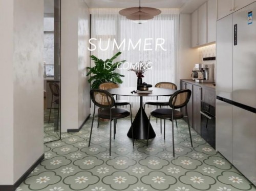 而“绿野清韵”则以低饱和度的淡绿色调为主,汲取西班牙摩尔复兴建筑中的经典四叶纹样,赋予空间清新、宁静的生命力。这款花砖适用于卫生间、阳台、玄关等多种场景,其温和的视觉感受能有效缓解都市生活的紧张节奏,为空间注入如林间薄雾般的舒缓气息,是现代轻奢与中古风格家居的理想选择。