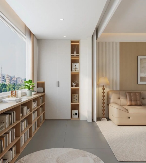 书桌、书柜与收纳柜一体化设计,打造出拥有治愈窗景的书房空间。