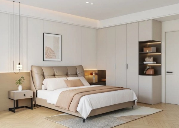 衣柜侧边定制三层开放格,方便随手放置包包。内侧延展出台面替代传统床头柜,格拉斯深布纹与开放格细节呼应,整体感强且实用便捷。