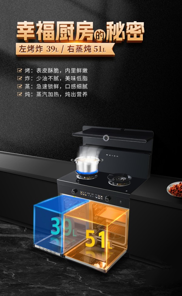 功能高效集成:油烟机、燃气灶、蒸箱、烤箱,甚至消毒柜,在美大集成灶上一体呈现。向上释放宝贵空间,向下拓展功能边界,告别厨电堆叠的杂乱拥挤,让厨房瞬间扩容,整洁有序。