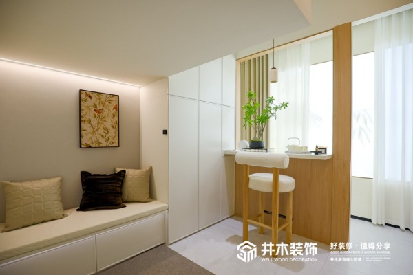 一切先进的理念与复杂的系统,其价值最终都需要在用户的使用体验中得到验证。在井木装饰的展厅内,一个精心还原自北京芍药居2号院的36平米极窄户型实景样板间,为我们生动地诠释了设计哲学如何赋能消费者的家居生活。在这个小空间里,我们看到了一体化的设计思维——门廊区域的洗漱台与换衣区、挂衣区被巧妙地整合为一个多功能模块,极大地节省了宝贵的通道面积;卧室采用地台榻榻米的形式,在满足基本休憩功能的同时,提供了远超传统床具的收纳能力。