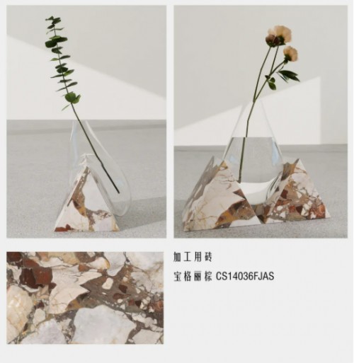 其次是水刀工艺品系列,这是该系列中最具创新性的尝试。马可波罗首次将瓷砖从“铺贴材料”转化为“可独立存在的装饰物件”。例如190×150×175mm的立体构件,选用宝格丽棕、维纳斯金等具有天然石材质感的砖体,经水刀精密切割后,变成实用的小饰品。适用于客厅、餐厅或卧室,既保留了瓷砖的耐用性,又赋予其艺术品的观赏价值。它打破了人们对瓷砖的固有认知,让这种材料真正“走进生活”,成为可触摸、可欣赏的日用之美。