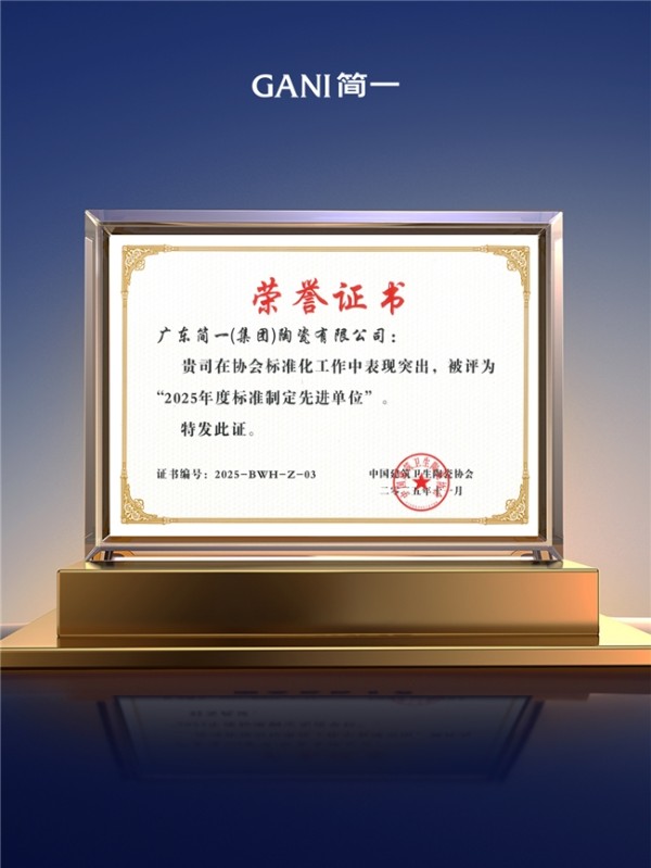 (广东简一(集团)陶瓷有限公司获得“2025年中国建筑卫生陶瓷协会标准化工作先进单位”荣誉证书)