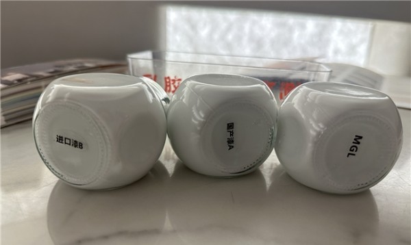 我按照他们教的方法,依次打开3瓶小样凑近闻。前两瓶刚拧开盖子,刺鼻的化学气味就扑面而来,尤其是其中一瓶,闻了不到两秒就忍不住皱起眉头后退半步。第三瓶打开时我本没抱太大期望,没想到凑近后只闻到一丝淡淡的乳液清香,几乎没有刺激性气味。当我指着第三瓶说“就选这个”时,三家公司的设计师都笑着公布了答案——瓶底标着“MGL”的德国美阁乐除醛漆。