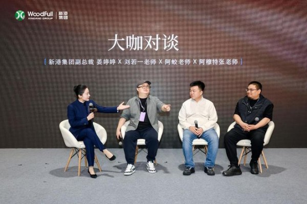 在 「大咖对谈」 环节,姜婷婷副总裁与人造板领域标准起草人及新港首席产品顾问刘若一、抖音工艺头部博主徐远蛟(木作阿蛟)、阿穆特品牌创始人张丙辉进行了一场联通行业全链条的深度对话。他们分别从人造板、定制工艺、交付标准等多元视角,共同探讨了“板材行业的产品价值应该如何呈现”“2026年行业解题思路”两大话题。阿蛟老师谈到,此次新港的展位与大师系列饰面让他眼前一亮,未来,除了看得见摸得着的产品外,搭载优秀的设计师去做落地是一个解题方向。而阿穆特张总说到,产品做好做漂亮是基础,上升维度去关注用户的感受,才是最好的解题思路。他一直喜欢使用新港产品的原因,也正因如此。