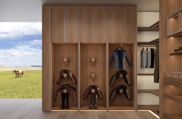 依托专业收纳智慧系统,空间与行为和谐共鸣。模块化分层结构,根据尺寸、重量、频次、用途,为不同骑手用具与马匹装备规划专属归处。顶层静栖区安放季节性装备,中层高频区触手可及,底部及抽屉稳承载重配件。秩序之下,每一次出征皆从容启程。该空间可与花隐衣帽间打通,并根据空间大小和不同身份,通过模块化分层设计,实现高自由度的模块组合搭配。智慧分区与灵活布局,让马术装备与日常服饰有序共处,风格浑然一体。