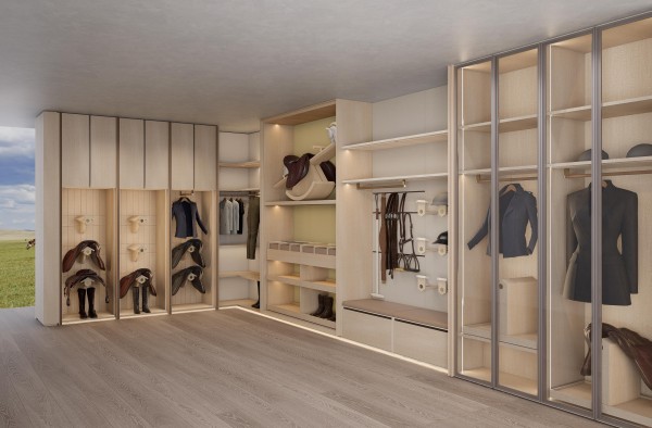 其中,更为马术装备量身打造了柜体光系统,以多层级设计提升展陈质感:柜体柔光灯清晰勾勒马鞍轮廓,柜顶聚光灯凸显奖牌璀璨,柜身暖金灯带还原皮革油润纹理。多层级的光影交织,赋予马术空间如私人藏馆般的艺术表现力。当专业分层系统、馆藏级光影与静雅美学浑然一体,空间便超越功能,成为荣耀的叙事场。它见证着在方寸之间整理行装,于天地之间历练内心的完整旅程,让骑士精神超越马背,沉淀为自由从容的骑士风范。