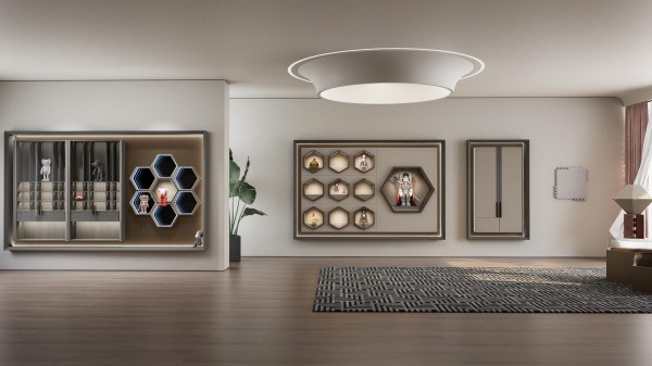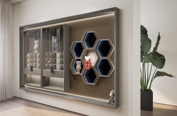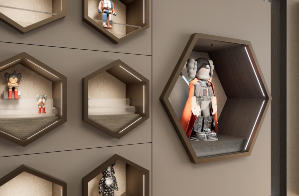 智慧收纳模块以数据为驱动,深入分析主流潮玩尺寸与重量,打造模块化的潮玩收纳系统,随需组合的潮玩柜,从迷你盲盒到限量大娃,再到原装包装盒,皆能各得其所。蜂巢六边形结构单元格采用前口亚克力与木作无缝贴合工艺,内置深渊镜面,为潮玩搭建沉浸式展示舞台。核心C位灯光设计堪称点睛之笔,前口斜打光消除藏品面部阴影,手办柜底部内置静谧转台,顶部配备可移动磁吸射灯,实现精准焦点照明,让藏品在光效中从容旋转,静动之间全方位展现魅力。