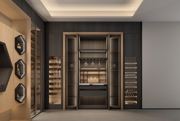 同时,中岛配备嵌入式恒温酒柜与雪茄柜,以“显”的通透格局,展现收藏的气度,酒杯酒具则以“隐”的巧思设计,将杂乱转为有序,构筑出一方令人沉浸的社交秘境。中岛桌面可调光旋钮可随心定义空间情绪,让收藏、品鉴、社交在一方空间内流畅衔接。隐藏式水槽配置冲杯器与升降龙头,净杯、净手、净心,品酒仪式感油然而生。整个酒窖空间既可作为明亮的珍藏展厅,也能切换为暖黄的社交秘境,在酒的光影之间,重塑属于当代人的栖心之地。