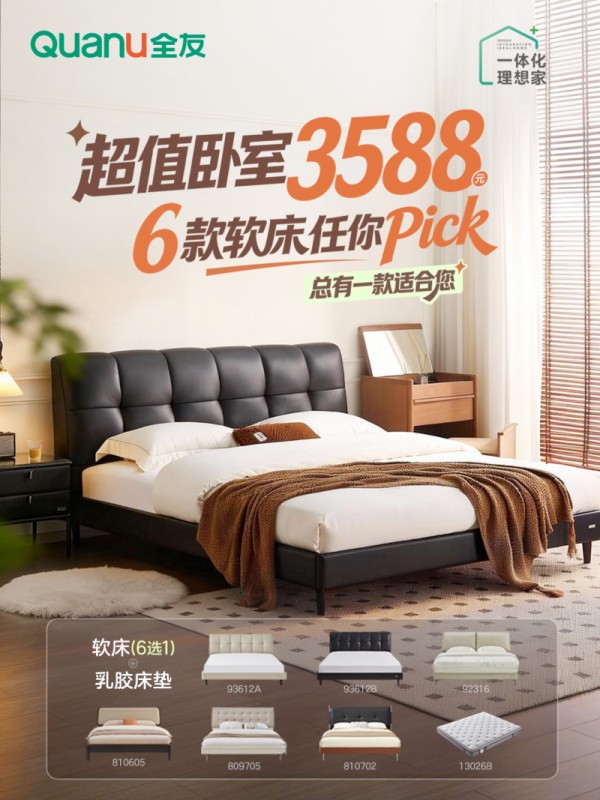 全友深入洞察消费者选择家具的痛点,在年末特别推出「3588元卧室焕新套餐」。仅需3588元,即可购入包含1.8米高颜值大床与优质乳胶床垫的标配套餐。以一步到位的高性价比方案,化解选择难题,轻松打造理想卧室。