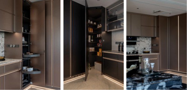 攻克空间痛点,实现优雅从容的人性化交互。FotileStyle在厨间细节方面,采用电动升降调味篮,触控升降设计,轻轻一碰就能降到手边随时取用,升起时“归隐”于柜内。转角飞碟拉篮,轻轻一拉转角深处的物品即可转到面前。而“钻石库”转角设计则充分将转角空间打开,达到百分百利用率,敲一敲开门器,即刻开门。