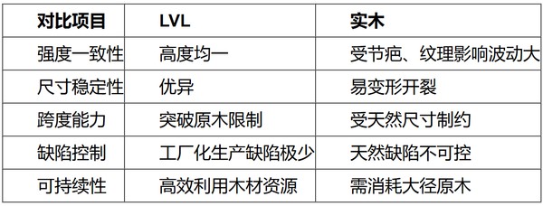 尺寸稳定性强:相比实木,LVL几乎不发生翘曲、收缩,温湿度变化下仍保持结构稳定。